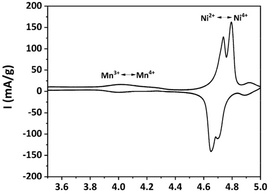 The electrochemical properties of the as-prepared LNMO were evaluated by CV. The obtained cyclic voltammogram is plotted in Figure 8.