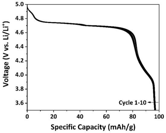 The specific discharge capacity of the as-prepared LNMO was determined by galvanostatic cycling between 3.5 V and 5.0 V with a constant current of C/20 for 10 cycles. The C-rate was calculated with the theoretical capacity of LiNi0.5Mn1.5O4, i.e., 146.7 mAh/g. Figure 9 illustrates the discharge curves of the as-prepared LNMO. At the 10th cycle, the as-prepared LNMO exhibited a specific discharge capacity of around 97 mAh/g. As revealed by the pXRD result, MnNi6O8 impurity phase was present in the as-prepared LNMO material, which is electrochemically inactive [58] in the investigated potential window but was included in the calculation of the active material. Thus, the specific discharge capacity of the as-prepared LNMO material is lower than the values reported in the literature [11,22,40,41]. Two voltage plateaus were observed at around 4.7 V vs. Li/Li+, which are attributed to the Ni2+/Ni3+ and Ni3+/Ni4+ redox processes [70]. A small voltage shoulder at around 4 V vs. Li/Li+ could be observed as well, which is contributed by the Mn3+/Mn4+ redox process [24]. The presence of a voltage shoulder at around 4 V vs. Li/Li+ indicates that the as-prepared LNMO exhibited a certain amount of Mn3+, which is in accordance with the pXRD and the CV results. The Mn3+ percentage contents (p(Mn3+)4V) in the sample can be indicated by the ratio between the discharge capacity recorded between 4.5 V and 3.5 V and the total discharge capacity of the 2nd cycle [25]: