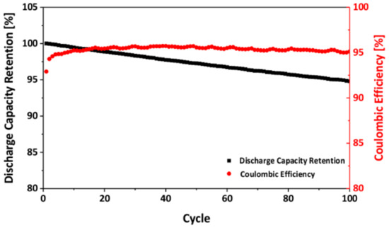 The cycling stability of the as-prepared LNMO samples was characterized by galvanostatic cycling. Figure 10 illustrates the discharge capacity retention of the as-prepared LNMO over 100 cycles. After 100 cycles, it exhibited a capacity retention of 95%, indicating a very stable cycling behavior. The coulombic efficiency of the sample increased in the first several cycles, which was probably due to electrolyte decomposition and solid electrolyte interface (SEI) formation [74]. Afterwards, it remained constant at approximately 95%. This reveals that there was an irreversible capacity loss on each cycle, which might be attributed to the decomposition of the electrolyte and the formation of an unstable SEI layer [74].