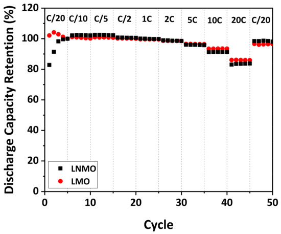 To study the rate capability of the as-prepared LNMO, galvanostatic cycling at various C-rates was performed. For purposes of comparison, the as-prepared LMO was also investigated. It must be noted that due to the difference in specific capacity of the as-prepared LMO and LNMO, the discharge capacity retention instead of the specific discharge capacity is illustrated to avoid misleading information. The discharge capacity retention was determined as the ratio of the discharge capacity at a certain cycle to the one at the 5th cycle at C/20, taking into accounts the SEI formation during the first several cycles. The discharge capacity retention of the as-prepared LMO and LNMO at various C-rates is plotted in Figure 11.