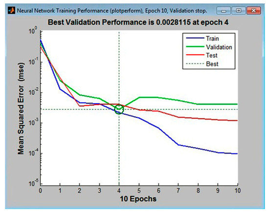 A hidden layer with 11, 12, and 13 neurons, with 10% of the tabular data assigned to the validation set, was first used to train the multilayer perceptrons. The following configurations had the lowest error values: MLP 3-11-4, the MLP 3-12-4, and MLP 3-14-4. These are shown in Figure 2, Figure 3 and Figure 4, respectively.
