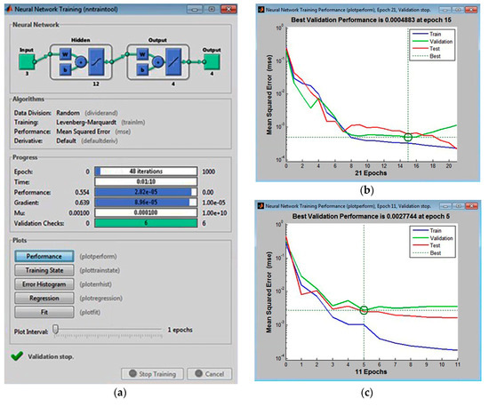 The lowest mean squared error in generalizing experimental data in MLP 3-12-4 (a) with various validation sets: (b) 5%; (c) 15% (calculated in Matlab).