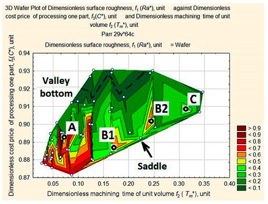 The target function is represented by the length of the vector in a normalized space and connects the origin of the coordinates with the point of the three-dimensional surface of estimates. Our aim is to identify the smallest of its lengths at the foot of the Ra* ridge in the area with the smallest values of C* and Tm* (see Figure 8). For this purpose, we shall consider surface projection estimates at fixed depths of cut—ap = 1 mm, ap = 0.75 mm, ap = 0.5 mm, and ap = 0.25 mm (Figure 8, Figure 9, Figure 10 and Figure 11).