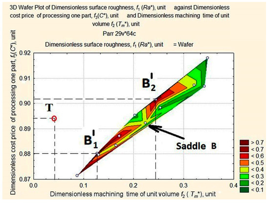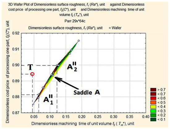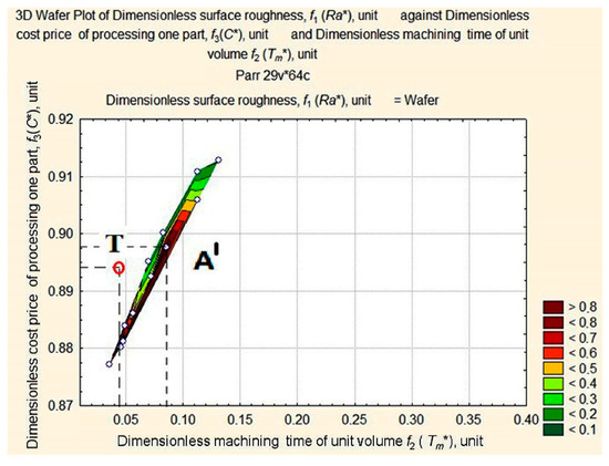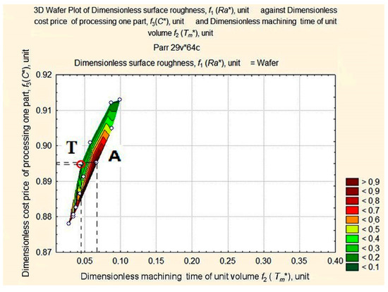 The optimum must be located at the foot of the ridge in the area of high-speed turning conditions that are most likely to lead to maximum tool wear. According to Figure 8, Figure 9, Figure 10 and Figure 11, we limit ourselves to the cutting conditions at the depth of cut ap = 1 mm, as in this case all values of Ra* are located near the minimum vector estimation F (0.0449; 0.8948; 0.1253), which is marked by point T.