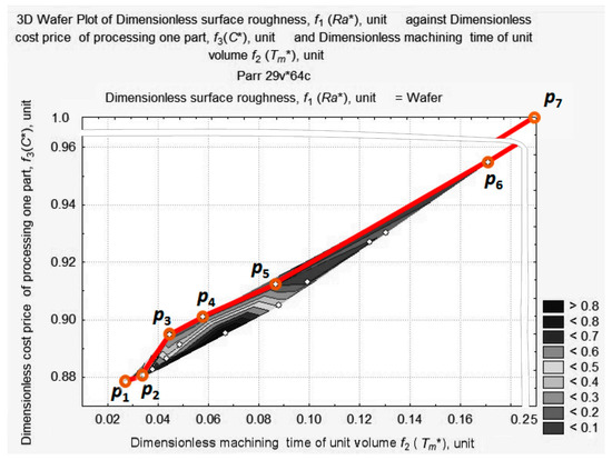 At this depth of cut, ap = 1 mm, four graphic dependencies, Ra* = f(C*, Tm*), were constructed, corresponding to the fixed vc = 250 m/min, vc = 200 m/min, vc = 150 m/min, vc = 100 m/min, and variable, fr, value. After matching the obtained curves with the projection (see Figure 8), we obtained the seven reference points of the Pareto frontier. They are shown in Figure 12: p1 (0.0281; 0.8782; 0.8135); p2 (0.0343; 0.8824; 0.8273); p3 (0.0449; 0.8948; 0.1253); p4 (0.0561; 0.9012; 0.1072); p5 (0.0860; 0.9123; 0.0982); p6 (0.1710; 0.9547; 0.0514); p7 (0.2500; 1.0000; 0.7903).