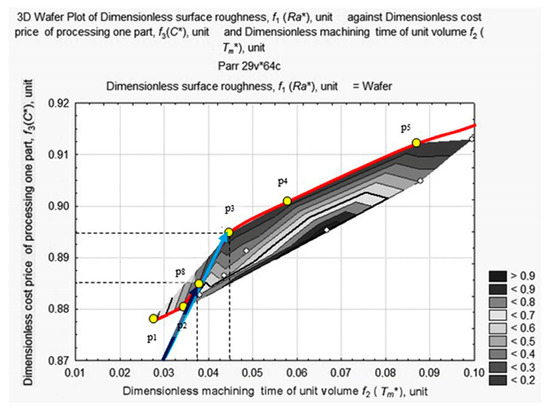 Further restrictions were imposed in the form of design documentation requirements and the minimum acceptable surface roughness value was defined at 0.800 μm, which is point p8 on the Pareto frontier curve, having the coordinates (0.0372, 0.8851, 0.300) in Figure 13. In this case (see Figure 13, blue estimates vector), the optimization criteria has a valid relation of importance that is–Ra*/Tm*/С* = 1.0/27.6/9.3, and the valid preference for points eight and three becomes y8 > Y y3 with an induced preference of x8 > X x3.