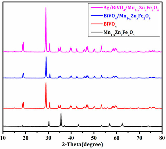 XRD patterns of Mn1−xZnxFe2O4, BiVO4, BiVO4/Mn1−xZnxFe2O4, and Ag/BiVO4/Mn1−xZnxFe2O4.