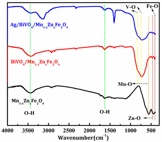 FTIR spectra of Mn1−xZnxFe2O4, BiVO4/Mn1−xZnxFe2O4, and Ag/BiVO4/Mn1−xZnxFe2O4.