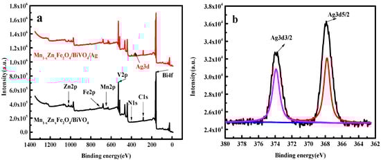XPS spectra of the magnetic composite (a) fully scanned spectra of BiVO4/Mn1−xZnxFe2O4 and Ag/BiVO4/Mn1−xZnxFe2O4; (b–g) narrow scan spectrum of Ag3d, O1s and V2p, Bi4f, Fe2p, Mn2p, and Zn2p of Ag/BiVO4/Mn1−xZnxFe2O4.