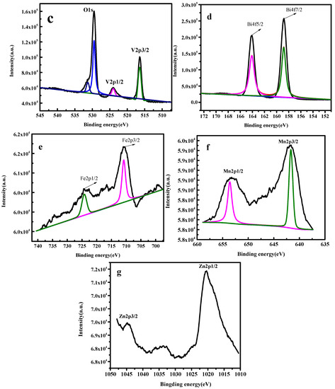 To discern the element contents in Ag/BiVO4/Mn1−xZnxFe2O4 and determine their valence states, XPS study was carried out. The binding energy peaks of Ag, O, V, Bi, Fe, Zn, and Mn were recorded in Figure 3. The peaks of O, V, Bi, Fe, Mn, and Zn elements were clearly observed in Figure 3a. Further comparing the fully scanning XPS spectra, it can be seen that the characteristic profile of Ag3d was obvious in Ag/BiVO4/Mn1−xZnxFe2O4 while Ag peak in BiVO4/Mn1−xZnxFe2O4 was not observed. Thus, it was deduced that the doping Ag in BiVO4/Mn1−xZnxFe2O4 was successful [25]. The peaks at the binding energy of 373.9 eV and 367.9 eV in Figure 3b was severally ascribed to Ag 3d3/2 and 3d5/2 [19], revealing the existence of Ag+. In Figure 3c, the peaks of O1s, V2p3/2, and V2p1/2 were located at 530.5 eV, 516.5 eV, and 523.4 eV, which were assigned to O2− and V-O bands. There were peaks of Bi4f5/2 and 4f7/2 at 164.1 eV and 158.3 eV in Figure 3d, indicating the presence of bismuth species of Bi3+ in BiVO4. Figure 3f displayed peaks at the binding energy of 641.5 eV (Mn2p3/2) and 653.1 eV (Mn2p1/2). The high resolution spectra of Fe2p as well as Zn2p were shown in Figure 3e,g. These peaks verified the presence of Mn1−xZnxFe2O4, which was consistent with the results of XRD and FTIR detection [26]. So, Ag/BiVO4/Mn1−xZnxFe2O4 was successfully assembled by in situ wet-chemistry synthesis method. This synthesis approach was simple, low cost, and environmentally friendly.
