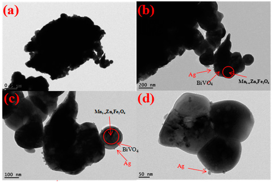 The morphological analysis of Ag/BiVO4/Mn1−xZnxFe2O4 was studied with transmission electron microscopy (TEM), and the results were displayed in Figure 4. By comparative experiments, it was demonstrated that the surface property of Ag/BiVO4/Mn1−xZnxFe2O4 was significantly improved when the appropriate dosage of polyvinylpyrrolidone (PVP) was used in the fabrication process of the composite. The improvement in properties resulted from the surface activity of PVP and the full uniform dispersion of Ag ions in the reaction solution. In addition, ethanol (solvent) further promoted the complete interface reaction of the ions with BiVO4/Mn1−xZnxFe2O4 particles. Namely, PVP could prompt the formation of nano-structural particles through in situ wet-chemistry method.