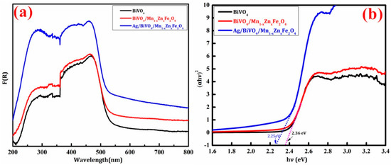 UV-vis diffuse reflectance spectrophotometry was a suitable and important technique to determine the light absorption for semiconductor photocatalysts [27]. Figure 5 showed UV-vis diffuse reflectance spectra (UV-vis DRS) of BiVO4, BiVO4/Mn1−xZnxFe2O4, and Ag/BiVO4/Mn1−xZnxFe2O4. It can be discovered from Figure 5a that the maximum absorption edge of Ag/BiVO4/Mn1−xZnxFe2O4 shifted to red light region, leading to the main absorption edge around 400 nm. First, the red shift was directly related to the electrons and Ag+ transformation between the conduction band and the valence band of BiVO4 [17]. Second, Ag particles had darkened color to enhance absorption of the visible-light for BiVO4/Mn1−xZnxFe2O4. Third, Ag particles could produce a strong surface plasmon resonance absorption. The band-gap energy (Eg) for Ag/BiVO4/Mn1−xZnxFe2O4 was about 2.25 eV. Eg values of BiVO4 and BiVO4/Mn1−xZnxFe2O4 in Figure 4b were about 2.36 eV. The incorporation of Mn1−xZnxFe2O4 did not change the optical properties of BiVO4 [18]. The relatively low Eg of Ag/BiVO4/Mn1−xZnxFe2O4 appeared to strengthen the absorption and sensitivity response for visible light. The significant enhancement of optics properties would be conducive to bringing high photocatalytic activity.