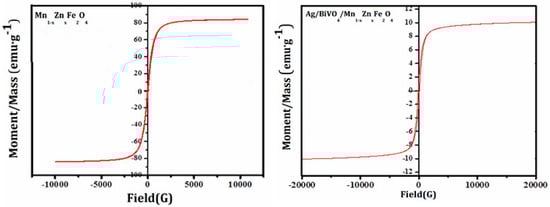 Hysteresis loops are the key way to characterize magnetization for magnetic materials. Figure 6 recorded the hysteresis loops of Ag/BiVO4/Mn1−xZnxFe2O4 and pure Mn1−xZnxFe2O4. The saturation magnetization (Ms) of Ag/BiVO4/Mn1−xZnxFe2O4 in Figure 6 was 10.04 emu/g. It was noted that large Ms was conducive towards the separation and recovery with an external magnet. Compared with Mn1−xZnxFe2O4, the Ms of Ag/BiVO4/Mn1−xZnxFe2O4 was declined by 87.5% due to the decrease of magnetic content per unit mass. More importantly, Ms of Ag/BiVO4/Mn1−xZnxFe2O4 was larger than that (7.01 emu/g) of Mn1−xZnxFe2O4/Bi2O3 [21]. The magnetic property was conducive to the stable activity of Ag/BiVO4/Mn1−xZnxFe2O4. The result revealed that the as-prepared magnetic photocatalyst was easily recovered by an external magnet. Therefore, it was concluded that Ag/BiVO4/Mn1−xZnxFe2O4 with good magnetic property possessed a high recovery rate.