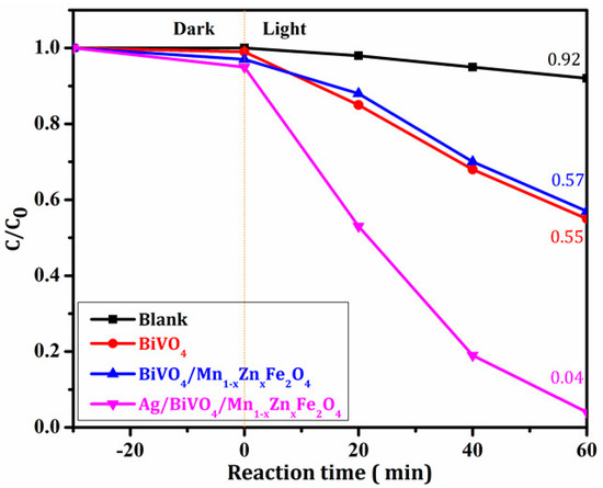 The photocatalytic performance of the samples under visible light irradiation was evaluated with the RhB photodegradation, and the result was shown in Figure 7. There was only a little degradation rate in the blank test (without any photocatalyst), indicating the poor self-degradation of RhB. The degradation rate for BiVO4 and BiVO4/Mn1−xZnxFe2O4 was approximately 45.0% after 60 min reaction. The same degradation rate proved that the introduction of Mn1−xZnxFe2O4 did not cause the activity loss of BiVO4. Figure 7 indicates that the degradation rate for Ag/BiVO4/Mn1−xZnxFe2O4 reached to 96.0% under the same condition. The setting time was only 60 min in this photodegradation test of RhB. Hence, the photocatalytic property of Ag/BiVO4/Mn1−xZnxFe2O4 was obviously higher than that of BiVO4 and BiVO4/Mn1−xZnxFe2O4. It meant that only 12.0 wt % Ag brought outstanding improvement in photocatalytic ability of BiVO4/Mn1−xZnxFe2O4.