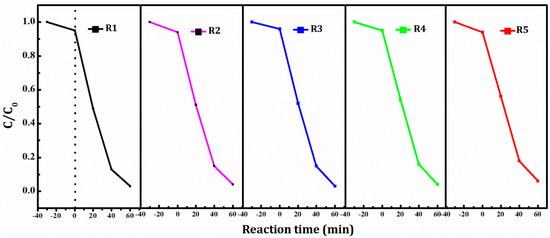 The repeatability of the photocatalyst was detected by cycling tests. After each cycle, the catalyst was separated by an external magnetic field, then washed and dried for the next cycle.