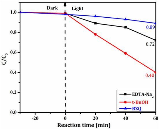 Radical scavengers were used to study active species in photocatalytic reaction, the result was displayed in Figure 9. In details, the degradation rate of RhB in Ag/BiVO4/Mn1−xZnxFe2O4-EDTA-Na2 (h+ scavenger) lowed and reached to 28.0%, which was significantly lower than that of Ag/BiVO4/Mn1−xZnxFe2O4. Under the same condition, the degradation rate steeply went down when BZQ (•O2− scavenger) in place of EDTA-Na2 was added into the reaction solution, the rate was only 11.0%. However, the introduction of t-BuOH (•OH scavenger) caused a large decrease in the degradation of about 60.0%. Namely, the change of the degradation rate in Ag/BiVO4/Mn1−xZnxFe2O4-t-BuOH was the smallest among three radical scavenger tests. The results illustrated that free radicals were major active species, and that •O2− played the domination role though •OH and h+ took part in the photocatalytic reaction.