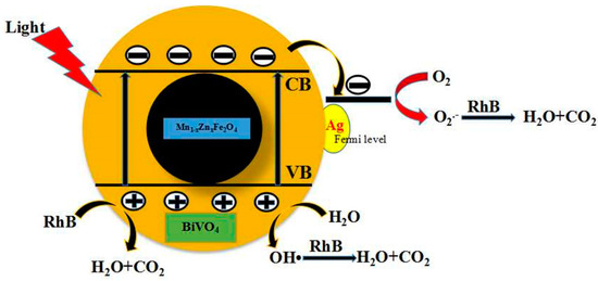The electron transition occurred between valence band and conduction band, generating the photoelectrons and holes when the photon energy was higher than Eg of the semiconductor. The possible transition of photo-induced electron and hole was used to express the photocatalytic process under light irradiation. The photocatalytic mechanism of Ag/BiVO4/Mn1−xZnxFe2O4 was described in Figure 10. In detail, e- transferred to the surface of Ag particle, the dissolved oxygen (O2) could capture the electron and form the super oxygen radical (•O2− ) through the Fermi level surface resonance. The adsorbed H2O in the surface of Ag/BiVO4/Mn1−xZnxFe2O4 could be oxidized by holes (h+), yielding hydroxyl free radical (•OH). Both •O2− and •OH had a large oxidation ability and decomposed RhB into CO2 and H2O. At the same time, holes themselves prompted the degradation-oxidized of RhB [26]. Thus, the doping Ag was favorable to drive more •O2− and •OH radicals, strengthening the degradation of RhB in visible light irradiation.
