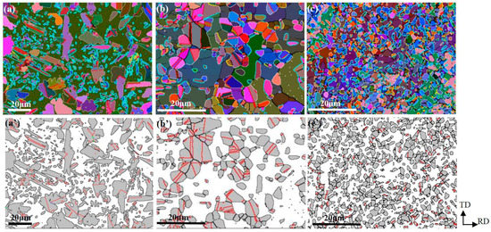 As for sample C, a quite different orientation distribution was generated in the precipitated γ grains, as shown in Figure 8. The orientation of α matrix is selected as near a (001) [010] cubic type in the current study, as shown in Figure 8a’. The orientations of the precipitated γ grains were remarkably strengthened after cross-rolling and annealing. There are three main grain orientations, i.e., (203) , (012) [100], and (123) , corresponding to the blue, orange, and brown grains in Figure 8b, respectively. It should be noted that the blue and orange grains are disorientated by 9.2°, indicating that the neighboring blue and orange grains can be related by LAGBs, contributing significantly to the density of LAGBs in the γ phase of sample C. It should be noted that the orientation distribution for γ grains with or without TBs do not exhibit much change, as shown in Figure 8c’,d’, suggesting that orientation randomization via twinning was not as pronounced in sample C as compared to samples A and B. This might be because twinning has a very limited effect on the orientation modification when γ grains have not undergone sufficient growth.