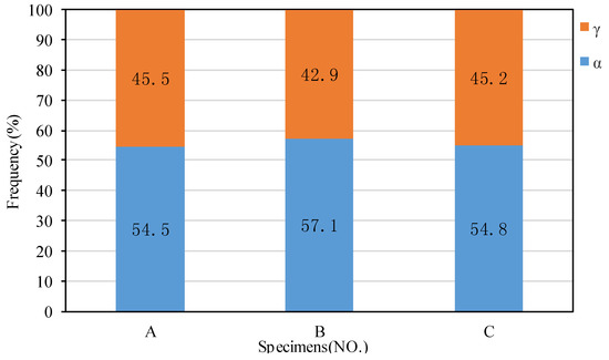 Figure 3 shows the EBSD-reconstructed microstructure and phase distribution in samples A, B, and C. The area fractions of γ and α are also given in Figure 4, indicating the area ratios of Aγ:Aα were close to 1:1 for all three samples. It is obvious that a nearly equivalent amount of γ phase precipitated from the undeformed supersaturated ferrite (sample A) and deformed supersaturated ferrite (samples B and C) upon annealing for 2 min at 1323 K. In addition, the band microstructure morphology was not present due to the high-temperature solid solution treatment at 1573 K prior to TMP. Considering the initial coarse ferritic matrix, the current paper mainly focuses on the precipitated γ within ferritic grains, as the grain boundary γ precipitation is beyond the scope of this work.
