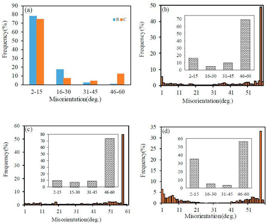 Misorientation distribution functions (MDFs) in α (a) of samples B and C, and in γ ((b)—A, (c)—B and (d)—C)).