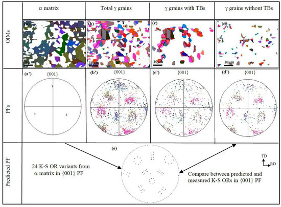 The orientation of the α matrix in sample B is similar to that in sample A. They are disorientated by 5.5°/. However, the precipitated γ grain orientation distribution was different. A slightly concentrated orientation distribution resulted in more precipitated γ grains as compared to sample A, which indicates that the pre-deformation of direct rolling exerted on the supersaturated α matrix has an orientation-strengthening effect on the precipitated γ grains. When solely the γ grains containing TBs were analyzed, the orientation concentration tended to weaken, as shown in Figure 7c,c’, confirming that twinning randomizes the texture of γ grains [22]. In addition, the γ grains containing no TBs usually held the K-S OR with the α matrix (Figure 2), but their orientation distribution in {001} pole figure (PF) indicated that no regular pattern of 24 K-S orientation variants (Figure 7d’) occurred, in contrast to the predicted {001} PF (Figure 7e).