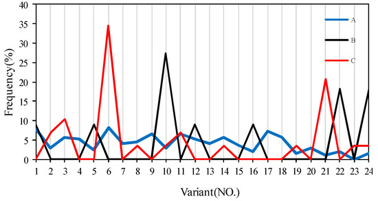 In order to determine the occurrence of variant selection, the OR matrix between each γ grain and its α matrix was calculated and then compared with the exact 24 K-S OR matrix. The misorientation between each two orientation matrices can be expressed in the form of angle/axis pairs (θ/<uvw>) [23,24,25]. Hence, a given γ grain can be identified as one of 24 variants within a certain angle tolerance. The number fraction of 24 variants within 3.5° is shown in Figure 9 for samples A, B, and C. It can be seen that 24 K-S variants are nearly uniformly distributed and no obvious variant selection was found in sample A. However, variant selection is remarkable in the cold-rolled and annealed samples, in particular in sample C. Variants 10 (v10), 22 (v22) and 24 (v24) in sample B and variants 6 (v6) and 19 (v19) in sample C were selectively introduced during annealing. The misorientation between each two variants could be calculated based on the orientation matrix, with values of 57.21°/, 47.11°/, 60°/[011] and 10.53°/ for variant pairs v10/v22, v10/v24, v22/v24, and v6/v19, respectively. It should be noted that v6 and v19 are probably neighbored, and therefore a large number of LAGBs might have been produced in sample C, sharpening the orientation texture of the γ grains. Although strong variant selection occurs and a strong texture should be expected, extensive twinning weakened the texture strength in sample B. The competition of LAGBs and TBs within γ grains is a very interesting phenomenon. The formation of LAGBs within γ grains does not destroy the K-S OR, whereas the introduction of TBs typically does. It is assumed that the grain pairs with similar orientation might not have hard impingement due to the high frequency of LAGBs. The sympathetic nucleation proposed by Aaronson and Wells [21] should be responsible for the formation of the prevalence of LAGBs in sample C. The prior γ precipitation acts as the favorable nucleation sites for the later γ precipitation with similar orientation instead of continuous growth of prior γ precipitation. Obviously, this process is significantly strengthened by cross-rolling subjected to a supersaturated solid solution. It is suggested that the orientation of γ precipitation nucleus strongly depends on the magnitude and distribution of residual strain introduced by prior deformation in supersaturated ferrite. The inhomogeneous strain caused by direct rolling promotes clustering and twinning for γ grains in sample B, whereas the relatively uniform strain produced by cross-rolling tends towards sympathetic nucleation during annealing. The underlying mechanism remains to be further investigated.