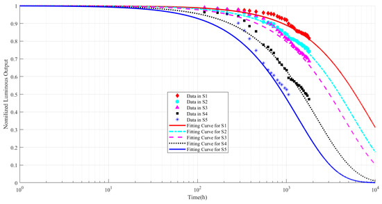 As has been reported in the literature [31], Wang et al. designed five sets of thermal and electrical stress levels to conduct accelerated degradation testing for LED-based light bars, where the junction temperature and driving current are designed as accelerated stresses. The first three sets of stresses are selected to solve the lifetime model proposed in this paper, while the remaining two sets of data are employed to verify the model.