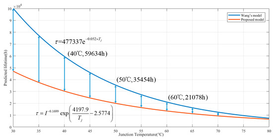 In addition, the predicted lifetime is smaller with the dual-stress lifetime model than that with Wang’s model due to the coupling effect of driving current on both lifetime and junction temperature. Therefore, it is revealed that driving current is another crucial factor when predicting lifetime and cannot be ignored in modeling with thermal and electrical stresses ADT data.