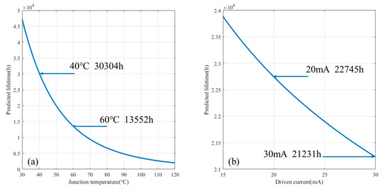 On the one hand, when LEDs work under a constant driving current, Equation (10) follows the form , which reveals that lifetime decays with junction temperature in an exponential form as shown in Figure 3a. Figure 3a also exhibits that the sensitivity of lifetime loss is much more significant at the low temperature are than that at the high temperature area. Therefore, the attempt to lower junction temperature is of practical significance in maintaining longer lifetime.