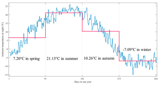 Unlike the indoor application, the outdoor application such as street lamp endures variable ambient temperature at different seasons in one year. The LED lamps works at rated current from 19:00 p.m. to the next day 5:00 a.m., lasting 10 h per day, while the ambient temperature varies with seasons. Take Beijing as an example: the average ambient temperatures at night from spring to winter are 7.20 °C, 21.15 °C, 10.26 °C and −7.09 °C respectively, as demonstrated in Figure 4. For the sake of facilitating calculation, the assumption that a quarter contains 91 days and exclusion of current fluctuation is reasonable.