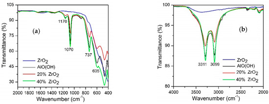 Figure 1 shows the FTIR spectra for (a), (b) as-synthesized AlO(OH)–ZrO2 nanopowders, (c) nanopowders after calcination at 600 °C, and (d) after annealing at 1400 °C. Pure ZrO2, boehmite (AlO(OH)), and Al2O3 were added as references. The bands observed for the as-synthesized samples were identified; they are listed in Table 1 [10,36,37,46,47,48,49,50,51,52].