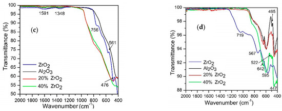 FTIR spectra for Al2O3–(20,40 wt %) ZrO2 in as-synthesized form (a,b), calcined at 600 °C (c), and after annealing at 1400 °C (d).