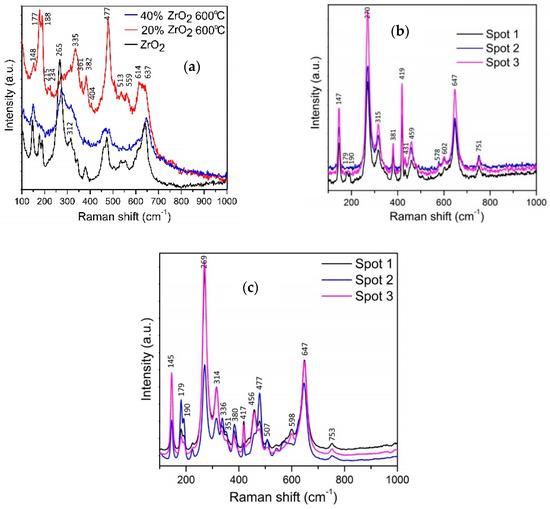 Raman spectra for (a) Al2O3–(20,40 wt %) ZrO2 after annealing at 600 °C, (b) Al2O3–20 wt % ZrO2 after annealing at 1400 °C, and (c) Al2O3–40 wt % ZrO2 after annealing at 1400 °C.