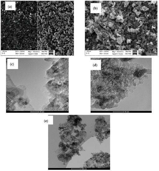SEM and TEM images for Al2O3–20 wt % ZrO2 after synthesis (a,c), and Al2O3 with 40 wt % ZrO2 after synthesis (b,d,e).