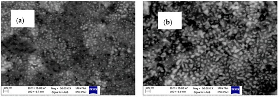 The surface morphology was evaluated using a scanning electron microscope (Zeiss, Ultra Plus, Zeiss, Oberkochen, Germany), and the compositions of the nanopowders were estimated semiquantitatively using energy dispersive spectroscopy (EDS) (QUANTAX 400, Bruker, Billerica, MA, USA). For this evaluation, the synthesized materials were compacted to pellets and sintered at 1300 °C for 1 h. Measurements were done as per the ISO 22309:2011 standard [42].