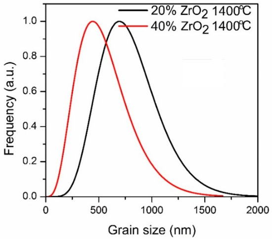 Particle size distribution for Al2O3–(20,40 wt %) ZrO2 nanocomposites after annealing at 1400 °C.