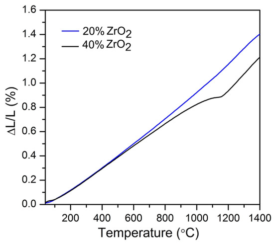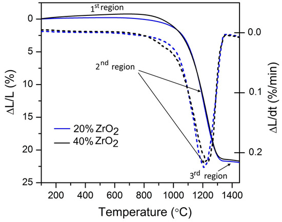 Dilatometry results for Al2O3–20 wt % ZrO2 and Al2O3–40 wt% ZrO2 are presented in Figure 6. Other thermal properties of nanocomposites were previously reported in [56]. Three distinctive regions in dilatometry curves can be found: