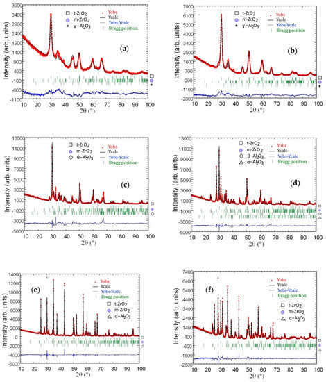 Rietveld refinement for Al2O3–20 wt % ZrO2 after annealing at 600 °C for 2 h (a), 1200 °C (c), 1400 °C (e), and Al2O3–40 wt % of ZrO2 after annealing at 600 °C for 2 h (b), 1200 °C (d), 1400 °C (f).