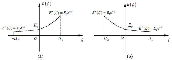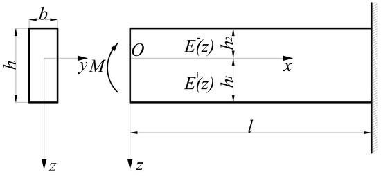 A bimodular functionally graded beam with a rectangular section dimension of h × b is subjected to a bending moment M alone as shown in Figure 1. This causes a bending of the beam in the plane coordinate system xoz. Note that due to the introduction of the bimodular effect in tension and compression as well as the functionally graded characteristic of the material, the neutral layer of the beam generally does not locate on the half height of the section. The x axis is established on the unknown neutral layer as shown in Figure 1. It is obvious that the zone below the neutral layer is in tension while the zone up the layer is in compression. Let the tensile and compressive section heights of the beam be and , respectively. Also, let the modulus of elasticity of the material in the tensile and compressive zones be and , respectively, while the Poisson’s ratios remain the same.
