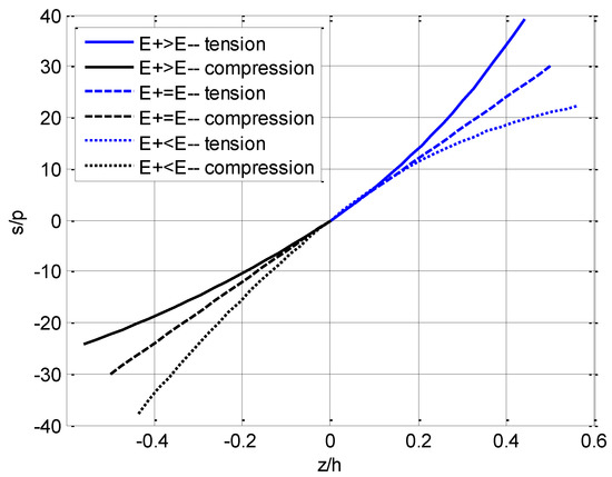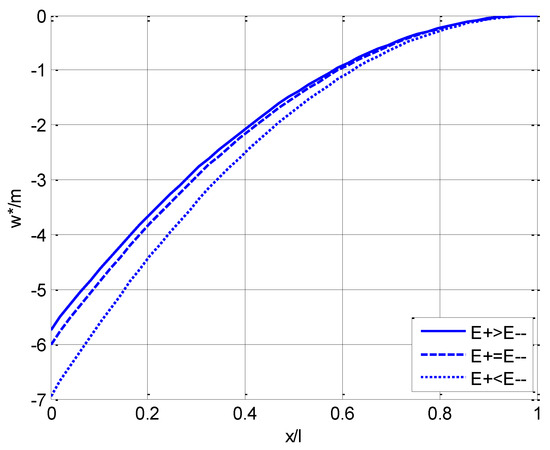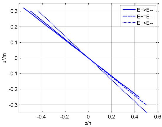 We should note such a fact that since the neutral layer is established on the x axis beforehand, the dividing line between tension and compression is always on , which may be easily seen from Figure 4, Figure 6 and Figure 7. Figure 4 shows that the horizontal displacement varies in a linear relation along the direction of the beam thickness as indicated in Equation (89). The maximum horizontal displacement takes place at the edge of the compressive area for and at the edge of the tensile area for , while the maximum displacement is equal for . Figure 5 shows that, for any point on the neutral layer, the deflection value when is always less than the corresponding value when .