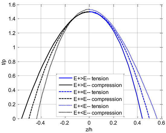 From Table 2, it is easily found that for , as the values of and increase, the tensile height decreases while the compressive height increases, which means that the neutral axis is tending downward (see Figure 1 and Figure 2, z axis is down); for , as the absolute values of and increase, the tensile height increases while the compressive height decreases, which means the neutral axis is tending upward. Besides this, we also note another interesting phenomenon, which is that due to the characteristic of an exponential function, the heights in tension and compression and are exactly reversed in some cases, including groups (a) and (g), (b) and (h), (c) and (i), and (e) and (k). For the values of a, they are the same as in the combinations above.