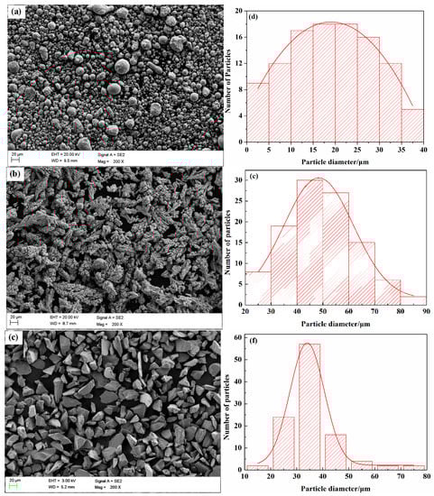 Commercially available spraying powders of Zn (Xinri Zinky Industry Co. Ltd., Shijiazhuang, China), electrolytic Ni (Shanghai Jiujia Pulvenous Material Co. Ltd., Shanghai, China) and alumina (Precursor Plasma Powders Co. Ltd., Yiyang, China) were used in the spraying process. The morphologies of the selected powders are shown in Figure 1a–c. The particle size distributions of at least 100 particles were measured and manually counted using ImageJ software (version 2X, National Institutes of Health, Bethesda, MD, USA). The results were transferred to origin-8.5 (Origin Lab Corporation, Northampton, MA, USA), where a histogram chart was prepared. This technique of particle size analysis is aligned with reported procedures []. The size distribution of powders is shown in Figure 1d–f. The Zn powders were produced by the atomizing method, and the powder size distribution varied from 2 to 40 µm with a purity higher than 96% (Figure 1a,d). Figure 1b,e show that the size of the Ni particles was in the range of +20–90 µm with a purity higher than 99.5%. The Ni powders were produced by the electrolytic method, and the particles were dendritic. The alumina powders had a particle size range of +15–80 µm with a purity higher than 99.5%. The powders exhibited irregular edges, as shown in Figure 1c,f, and they were produced by settlement encapsulation–dehydration.