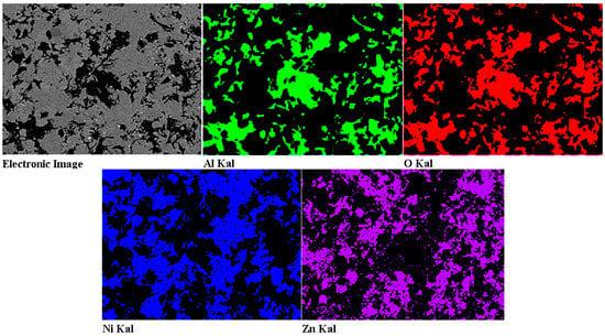 The SEM photographs in Figure 2 show the surface morphologies of the four types of Zn-Ni-Al2O3 composite coatings. The surfaces of the composite coatings exhibit many shallow pits from being hit by successive particles and a small number of inadequate, deformed particles. The roughnesses of the composite coatings with Ni powder contents of 10, 15, 20 and 25 wt % are 0.5600 ± 0.0386, 0.5704 ± 0.0431, 0.5882 ± 0.0358, and 0.5783 ± 0.0371 μm, respectively. The roughnesses of coatings slightly change with an increasing Ni content, mainly due to the influence of the coating thickness. Note that some researchers have discovered that the roughness of the coating surface increases linearly with the thickness of the coating [,]. Figure 3 shows the EDS mapping analysis of the polished top surface of the (80 wt % Zn–20 wt % Ni)-30 vol % Al2O3 composite coating, wherein the dark areas are the embedded Al2O3 ceramic particles, and Zn/Ni compositions are uniformly distributed. The distributions of O and Al shown in the figure are essentially coincident, which indicates that LPCS is a solid-state powder deposition process and that the sprayed particles do not undergo oxidation, phase transition or other undesirable processes. Therefore, the deposited coating not only retains the characteristics of the original materials but also exhibits a compact structure, low porosity and other characteristics that help maintain a high coating quality.
