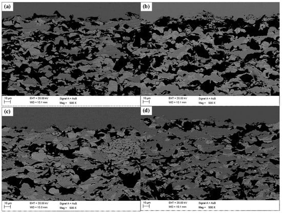 SEM image of the cross section of the composite coatings with different Ni powder contents: (a) 10 wt %, (b) 15 wt %, (c) 20 wt % and (d) 25 wt %. The darkest areas are the irregular alumina ceramic, the dark-gray areas are Ni, and light-gray areas are Zn.