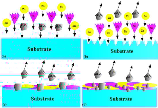 The cross-sectional morphology of the composite coatings with different Ni powder contents is shown in Figure 4. The coatings area pseudo-layered structure with a wave-like pattern, and the Al2O3 ceramic particles are embedded and distributed in the coatings due to the continuous high-velocity impact. The Al2O3 ceramic particles play several important roles in the activating behavior of the coatings and improving the deposition efficiency of Zn and Ni powders [,]. Based on reports in the literature and our experimental results, we propose that the deposition process of metal (Zn, Ni) and ceramic (Al2O3) particles primarily consists of the following two processes (Figure 5): first, the high-speed impact of metal and ceramic particles changes the surface profile of the substrate, as in a well-known grit-blasting procedure, especially due to the ceramic particles, which improves the bonding between the first coating layer and the substrate; the growth of the deposited coating primarily depends on the plastic deformation of the Zn and Ni particles arising from the high-speed impact of metal particles on the substrate. Second, after the deposition of the first layer, the high-speed impact of Zn, Ni and Al2O3 particles disrupts the oxide films on the surface of the metal particles and improves the conditions for metallic bonding, creating more favorable conditions for the mechanical interlocking [] of the particles forming consecutive layers; during this process, the pinning effect produced by the impact of the incoming ceramic particles on the already-deposited metal and ceramic particles leads to the fragmentation and refinement of the already-deposited ceramic particles.