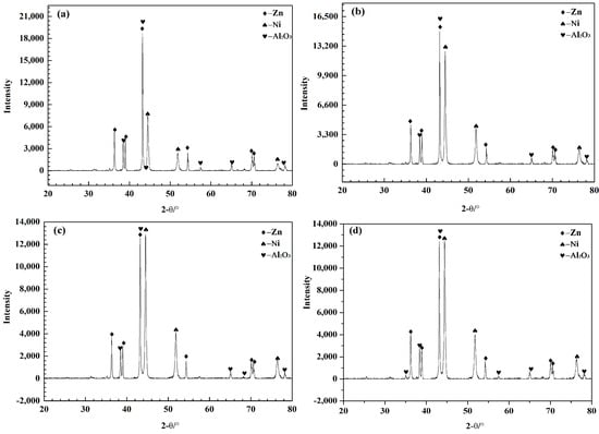 - According to the XRD, the composite coatings are primarily composed of metallic-phase Zn and Ni and ceramic-phase Al2O3. The cross-sectional morphology revealed thick, dense coatings with a wave-like stacking structure. The Al2O3 content of the composite coatings gradually decreases with increasing of Ni content.