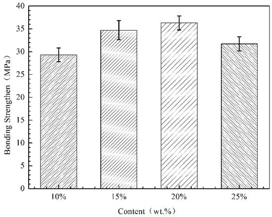 The bond strength test results are shown in Figure 7. The average bond strength of the four coatings does not linearly increase with variable Ni content. Koivuluoto [] prepared Zn and Ni coatings using the LPCS technology on steel substrates and obtained bond strengths of 33 and 8 MPa, respectively, due to the small plastic deformation of Ni particles during the spraying process, indicating that excessive Ni decreases the bonding strength of the coating.
