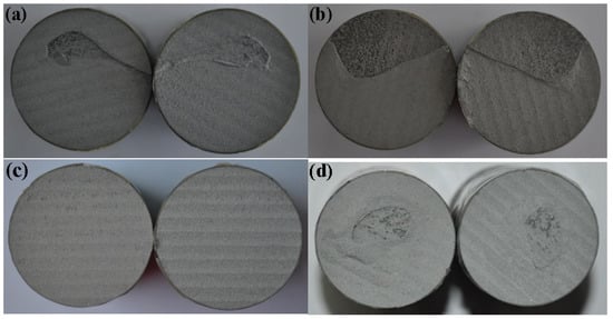 Photograph of the fracture section of the composite coatings with different amounts of Ni powder: (a) 10 wt %, (b) 15 wt %, (c) 20 wt % and (d) 25 wt %.