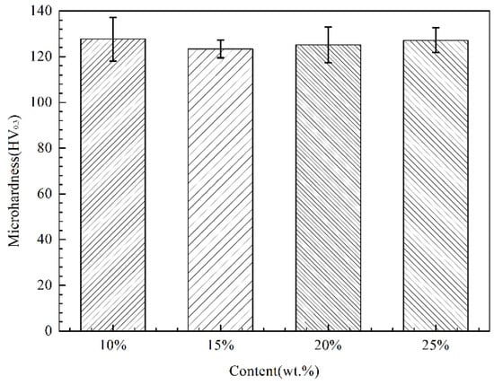 The Vickers microhardness was measured on the cross-section of the coatings using a digital microhardness tester (HVS-1000, Shanghai, China) with a load of 300 g and a holding time of 15 s. To reduce systematic error, for each sample, ten indentations were measured on the polished cross-section and the average microhardness value was determined.