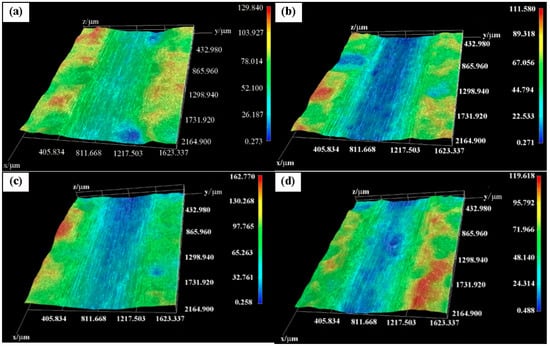 The three-dimensional morphology of the worn surface of the composite coatings is shown in Figure 11. It can be seen that the wear marks of (90 wt % Zn–10 wt % Ni)-30 vol % Al2O3 are shallower than those of the other three coatings, further confirming that this coating offers the best wear resistance. These results are in agreement with the wear loss values (Figure 10b).